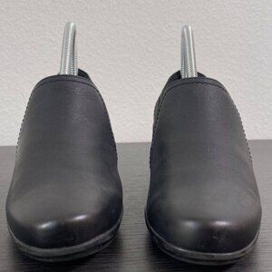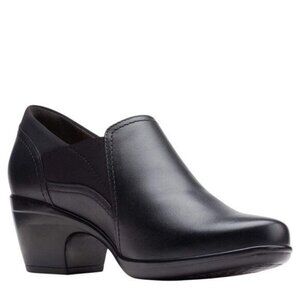 Clarks shoes, black leather shoes, women's heeled shoes, slip-on shoes, black dress shoes, comfortable heels, leather slip-ons, chunky heel shoes, size 8 shoes, black office shoes, Clarks women's shoes, professional footwear, women's heeled loafers