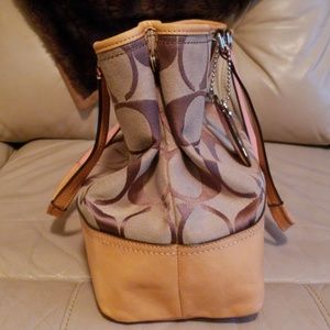 Pre-loved Coach bag from the Signature Collection. It is made of woven jacquard fabric specially treated to repel water and stains. This lovely is half Signature (light brown/dark brown) and half leather (light tan/camel/peach). It has an inside zipper with side functional buttons. It can be used as a tote as well as a satchel. It was purschased from Carsons in IL. Please see last pic for noticable stains and discoloration.