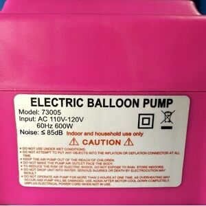 The used pink electric balloon air pump is a 600W blower with a sleek rectangular design and solid pattern. It operates on AC 110V 120V 60Hz and is made in China. Ideal for birthdays, weddings, and holiday decor, this decorative pump adds an art deco touch to celebrations. Designed for adult use, it includes one unit.