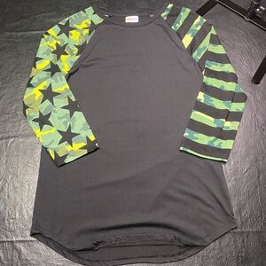 LulaRoe Randy Unisex Top. Large. Fits sizes: 14-16 (has a little stretch). Gently worn (it has a little area where the material is balling up a little - photo above) Smoke Free Home. This unisex shirt resembles a baseball T with its raglan, mid-length sleeves in contrasting, patterned fabric. Color: Black body with camouflage green sleeves (one has stripes and the other has stars).