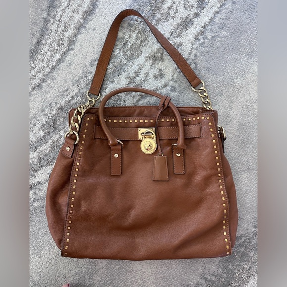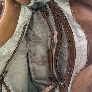 Dark Camel colored leather bag by Michael Kors. Exterior leather and hardware in great shape. Interior has some staining!!!!