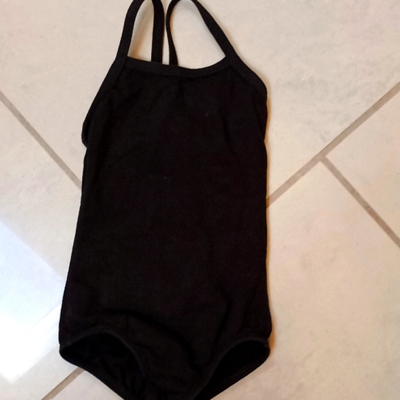 Used black Motion Wear leotard for dance. 91% cotton, 9% spandex. Size: small child (4-6).