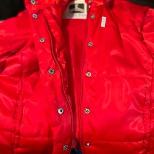 This a classic preowned women's NIKE red puff jacket with removable sleeves and tuck-in hoodie.
