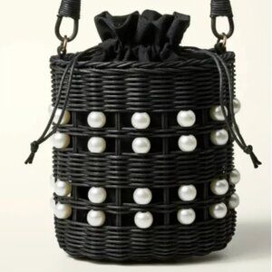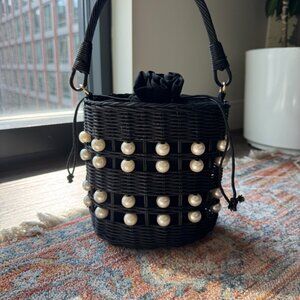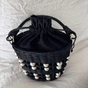 Chic black wicker bag adorned with elegant pearls. Perfect for stylish outings. Kate Spade for Target