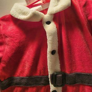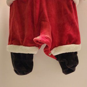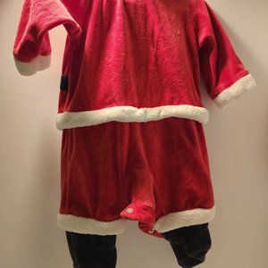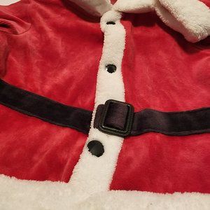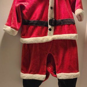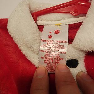 A used 3-6 months age Santa Baby Suit with decorative belt. Plush red and white 75% cotton, 25% polyester body, 100% polyester white trim, made in China. RN#50255, Color Red, Style SANB100. Machine Wash Cold. Wash separately, gentle cycle. Only non-chlorine bleach when needed. Tumble Dry low. Remove promptly. Cool iron as needed. USED? Very Good. As is, no returns. See photos for condition, details, and visual description.