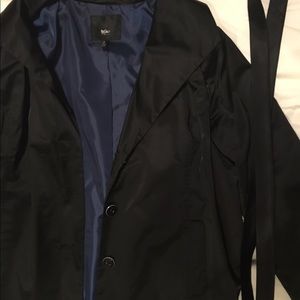 Black with blue lining. Black fabric belt. Poly, nylon, spandex.
