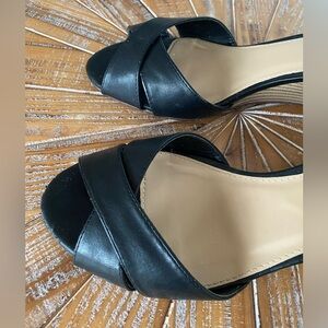Used Shoe Dazzle Black Faux Leather Mini Wedge Sandals Size 10. Fit TTS to a 1/8 size too small. The wedge platform measures approximately 2.5 inches.