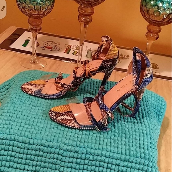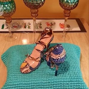 Very pretty royal blue, gold snakeskin design heels about 4 inches in height transplant clear strap across the toes only wore them twice!