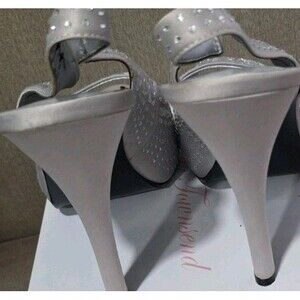 The product is a pair of used silver Lulu Townsend pumps in size 10. These high heels feature a solid pattern, open toe design, slip-on closure, and stiletto heel style. The shoes are suitable for various occasions such as casual, formal, and business events. Made with fabric and manmade materials, these pumps provide comfort and are designed in a stylish pump silhouette. Perfect for those looking for a metallic-themed heel to add to their wardrobe.