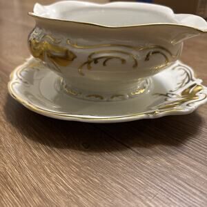 This vintage gravy boat by WAWEL is a luxurious addition to any dining table. Made of bone china in a classic white and gold color scheme, the Ambassador plated gravy boat is adorned with intricate scrolls, adding a touch of elegance to your serveware collection. Crafted in Poland, this gravy boat exudes quality and sophistication, perfect for serving gravy or sauce with a touch of Old World charm.