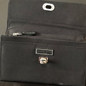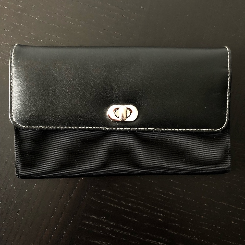 Used wallet (unknown brand). Front twist knob closure. Back has a pocket. Inside has 4 pockets and one zippered pocket.