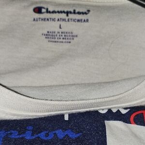 Classic white tee with a large multicolor Champion logo. Comfortable and stylish. Please note 3rd picture which shows a slight discoloration on shirt.
