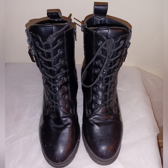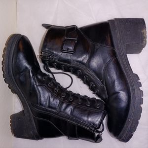 Used Rouge Combat Boots Womens Black Lace Up Mid Chunky Sole Leather with small flaws but in great condition.