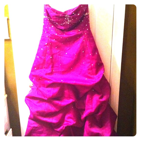Purple, floor length prom dress with small studs and gathering at the bottom.