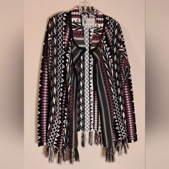 Zippers on each sleeve. Approximately, 20" armpit to armpit measurement. No rips, tears or stains. There are some strings from the fringe. Open front style. Smoke free/Dog friendly home.