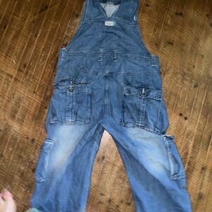 denim, farmer, grandpa style, classic overalls. Approximately 19 inches across the waist, 11 inch rise, 30 inch inseam, 60 inches long, though the straps are adjustable. In good, used condition. Minor wear. From a pet and smoke free house. Happy to bundle!