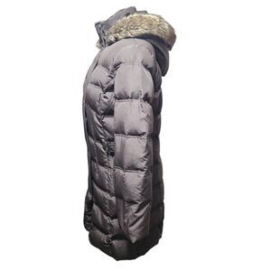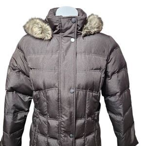 Utex Canada brown puffer coat with faux fur on hood. Removable hood, adjustable waist zip and button closure, interior pocket, exterior zip pockets. Approx knee length