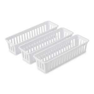 Mainstays Set of 3 Drawer Storage Narrow Utility Baskets A great system for organizing your home Crafted of durable plastic Slotted design allows light and air to circulate and helps inhibit mold growth Dishwasher safe for easy care Perfect for storing office supplies like staples, paper clips, pens and more Makes a great kitchen accessory for toothpicks, cutlery, spare change, and small gadgets Can be used in workshops and garages for fasteners, small tools, and parts for repairs Color: white Assembled Product Dimensions (L x W x H) 10.30 x 3.10 x 2.40 Inches