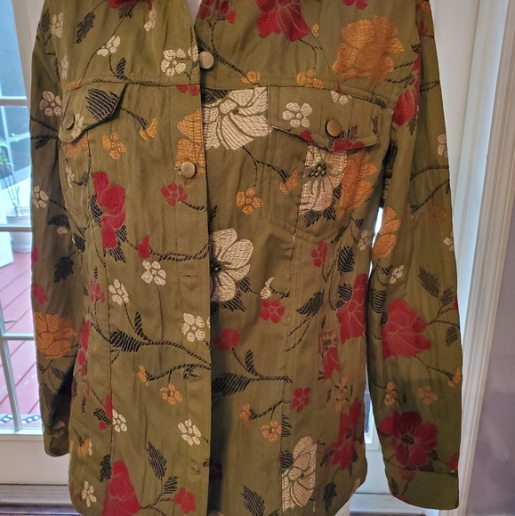 Sassy Jacket with Olive Background, with appliques of red,yellow, orange colors great with slacks, Jean's or skirt.
