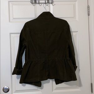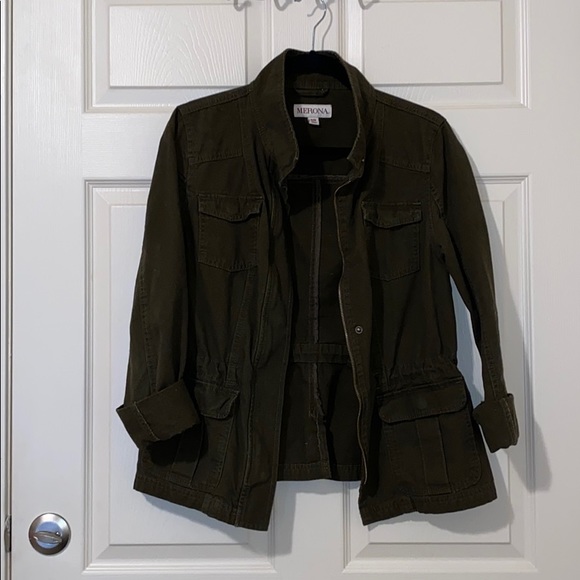 Your classic utility jacket! I love this one, it’s not super stiff but still looks great! All the buttons and zippers work, the drawstring cinches the waist! In good condition! Sleeves can be uncuffed to be full length.