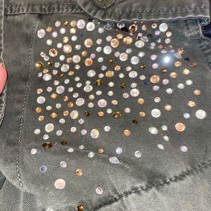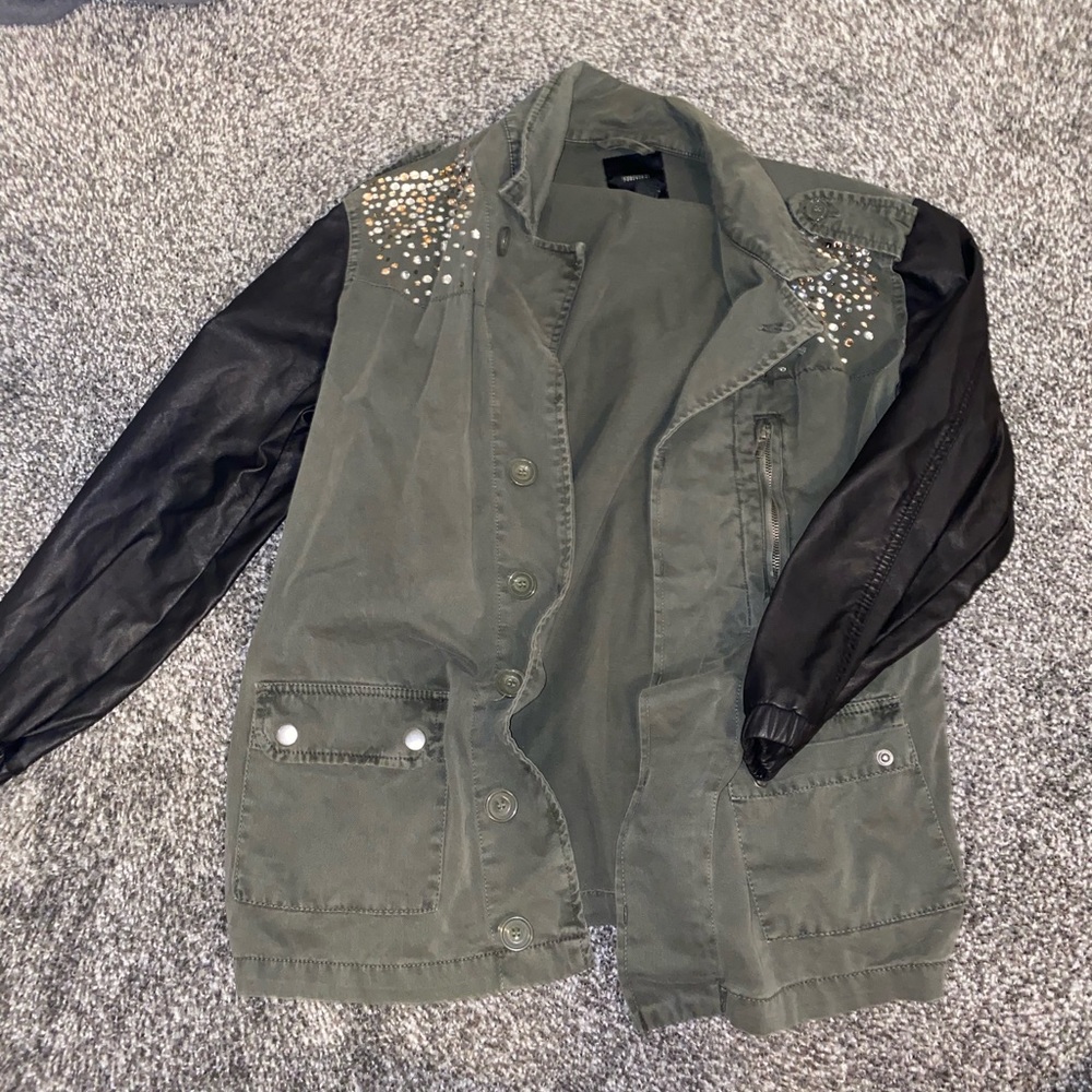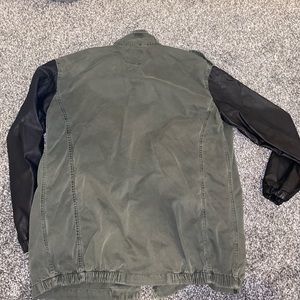 Never worn. Cute fashion jacket with cargo material for the body and “leather” sleeves. Great jacket for all seasons.