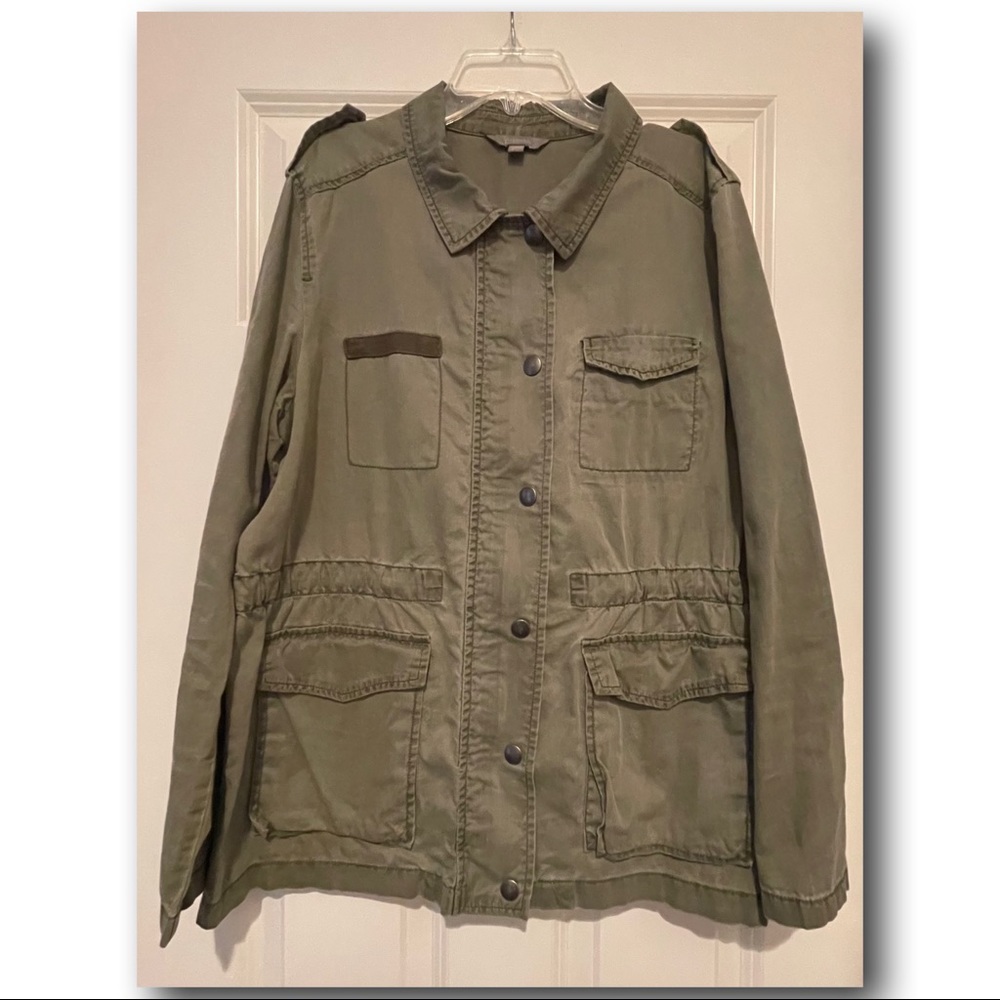 Olive Utility Jacket. Light Use, multiple pockets, zip and snap double closure