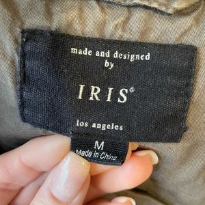 Utility shacket with pockets. Pockets have snap buttons. I’m 5’2 and this hits just below my hips.