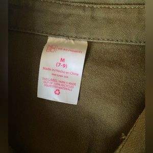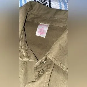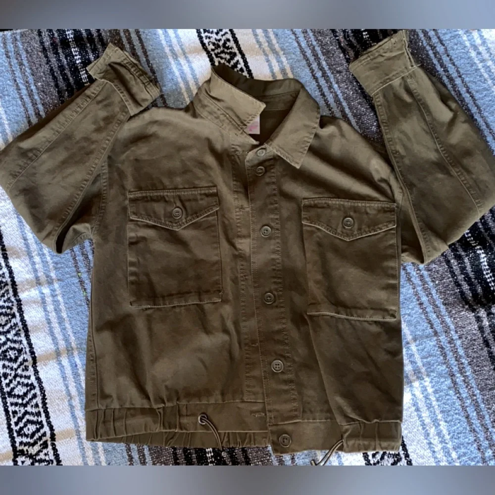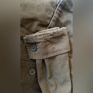 Army green utility jacket. Worn a small handful of times. Threads look like they are loose on the sleeves but I think it’s just the “worn” look. Cinches at the bottom. Very cute jacket! My daughter loved it but has outgrown it.