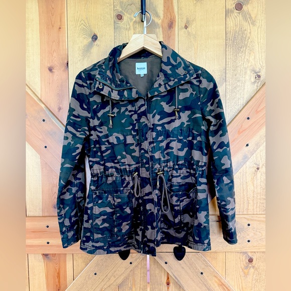 Camo print utility jacket with flattering waste slimming string tie