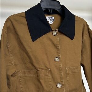 Elevate your wardrobe with this chic utility jacket, featuring a stylish tan body and contrasting black collar. Perfect for versatile styling. Crop fit and only worn once. PTP is 22” and length is 19”