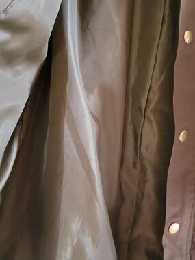 This jacket is an olive green cotton utility jacket, a versatile piece defined by its military-inspired design and multiple functional pockets. It features a concealed front zipper with a snap-button wind flap, four large exterior flap pockets, and a hood.
