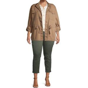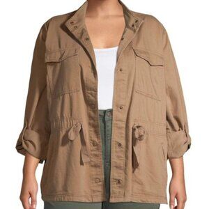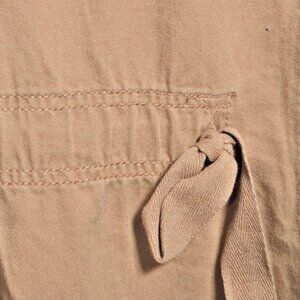 Features snap-front closure, 3/4 sleeves with roll tan accent, two front slash and flap pockets, and drawstring at waist. Unlined. ~29”. Cotton.