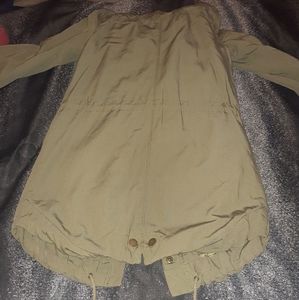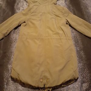 Cute coat that I only wore twice since i couldn't zip it past my chest 🙊 Its a mossy green color with lots of pockets! Its insulated and semi water proof. Hood is deep enough to go over a messy bun 👌 3 pull strings 1 around waist to help with the hourglass shape 2 around the hood to tighten around your face 3 at the very bottom. Zips bottom to neck with over lapping flap with buttons to secure.