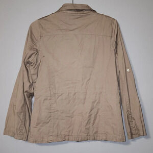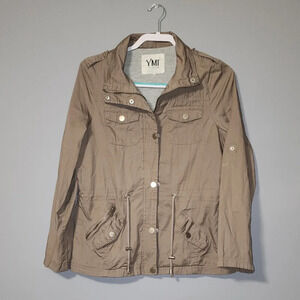 This is a YMI womens utility jacket in brown, size medium. This jacket has lots of pockets and storage. The accents are so cute!
