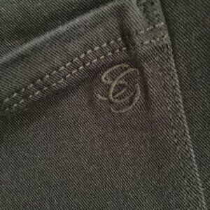 Features: zip-front closure, four pockets, band edged angled front pockets with stitch detail, ankle length, zip detail at leg openings