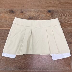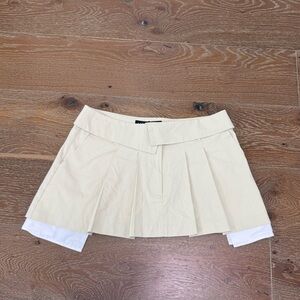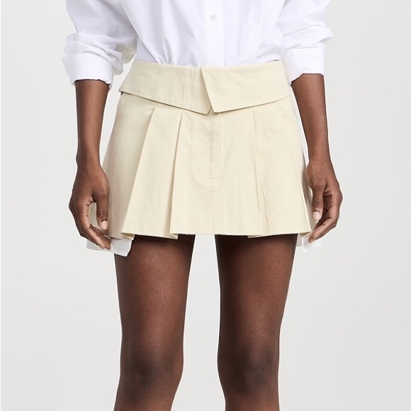 “This mini skirt has a pleated design, side pockets with exposed detailing, an envelope style waistband, a low rise fit, and a zipper and clasp closure”