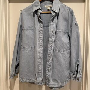 Treasure and Bond Utility Shacket, size Small, Chambray color, 100% cotton, hidden-snap placket, and chest patch pockets. Runs slightly large and in excellent condition.