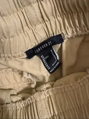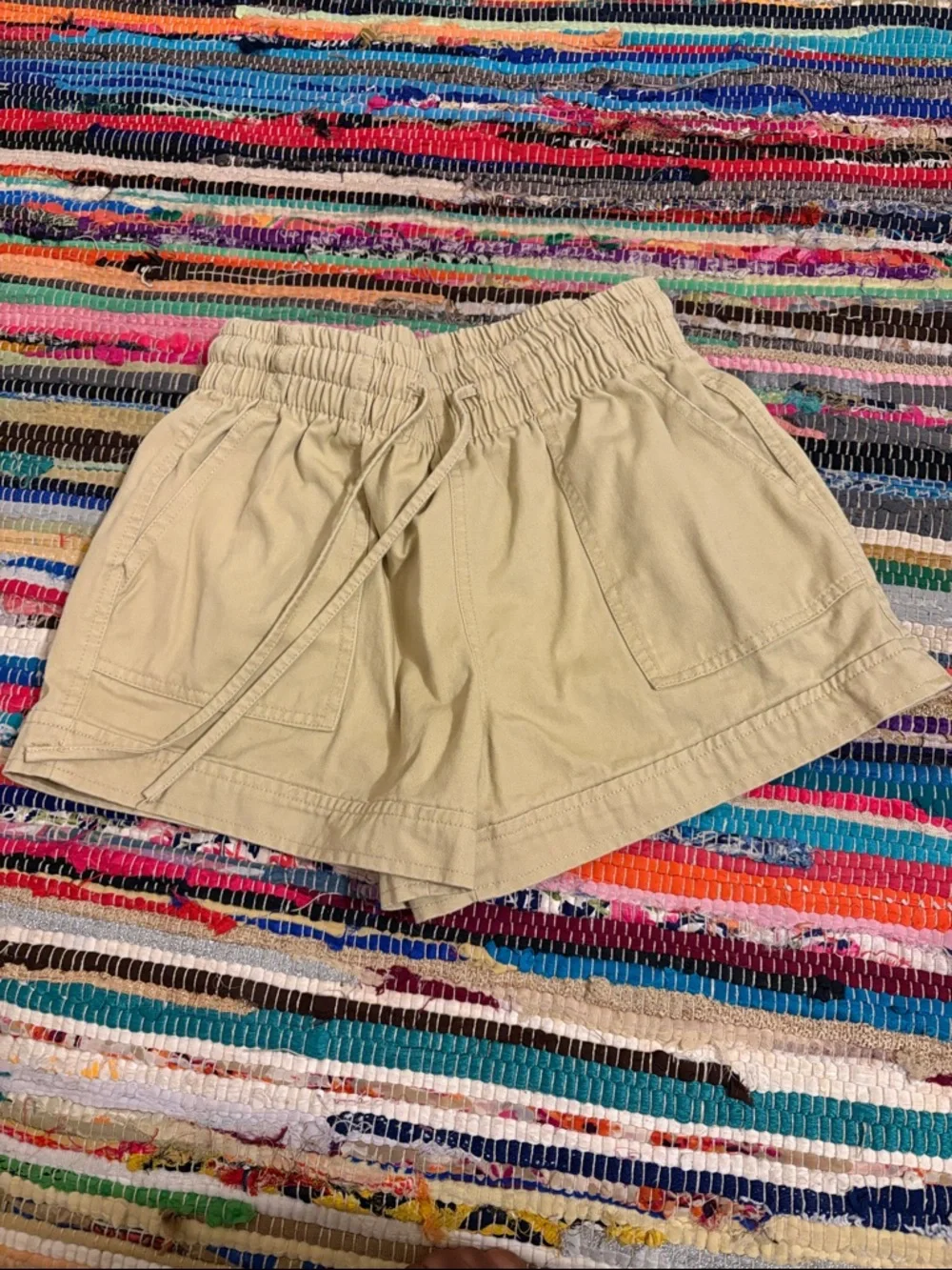 Casual beige utility shorts with an elastic drawstring waistband. Front patch pockets