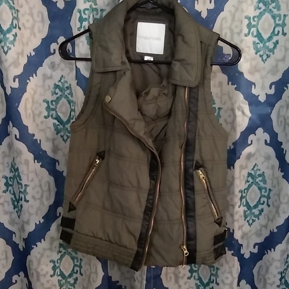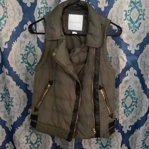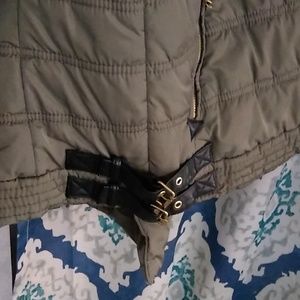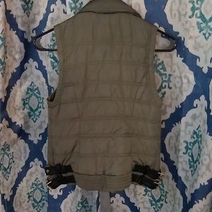Pleather buckles on the side and leather detail down the zipper. Army green with gold zippers and buckles. Adorable vest.