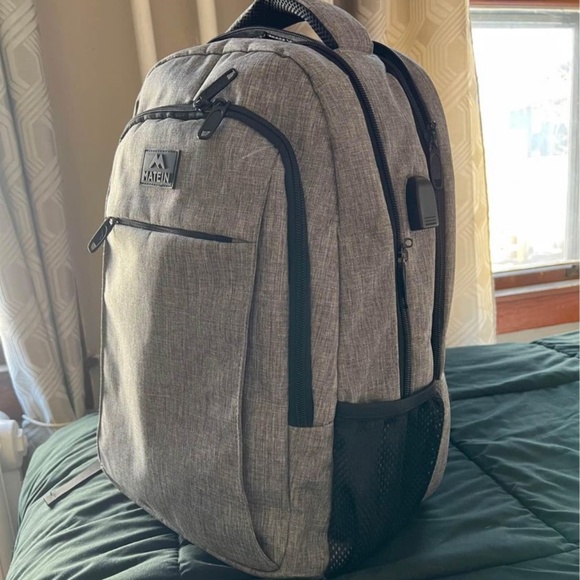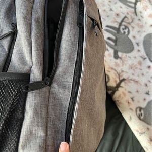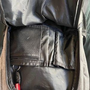 Matein bag, hardly used. Two water bottle side pockets, six outer pockets, eight interior pockets, a charging port, and a sling to put over suitcases.