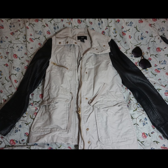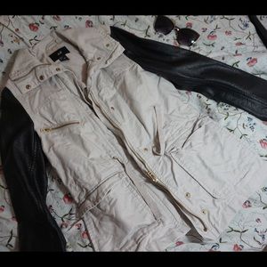 Utility jacket with contrasting nude and black pleather sleeves. Has gold zipper detailing and deep pockets