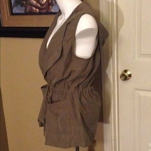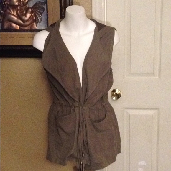 Olive green utility jacket. Side pockets. No sleeve, rope tie closure, hoodie. 100% polyester. No rips or stains.