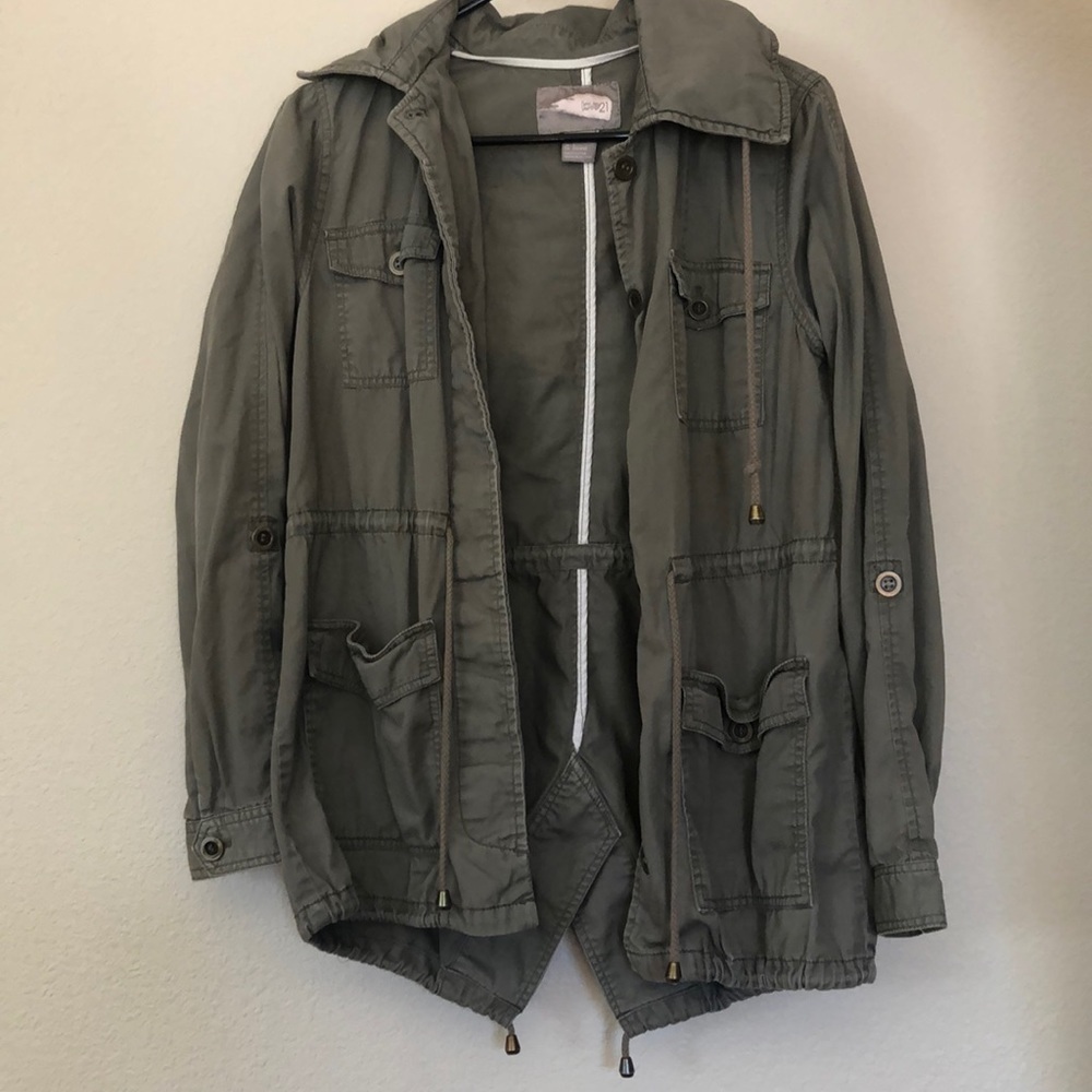 Olive green utility jacket. Lots of pockets! The hood can be rolled into the collar if needed. Sleeves can also be rolled up.