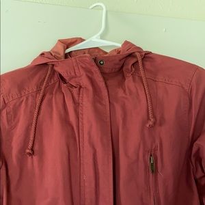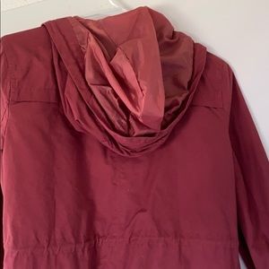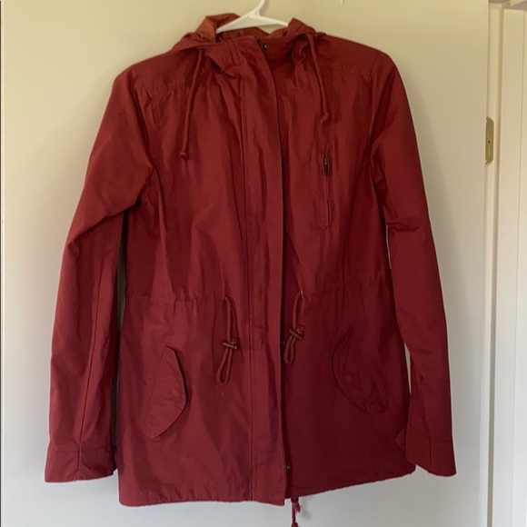 Burnt red/orange utility jacket. Brand new. Pocket. Cinched waist. Hooded.