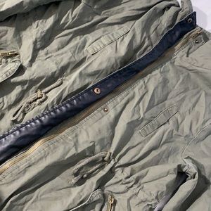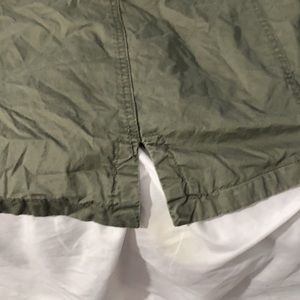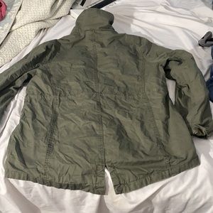Olive green or army green neg utility jacket zippers, button pockets, drawstring waist