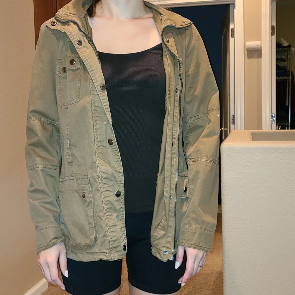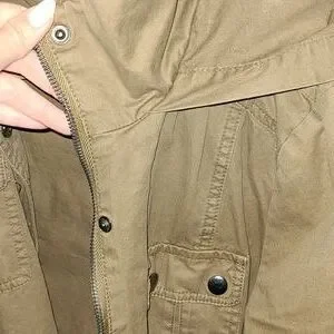 utility hooded jacket with button closure. no belt