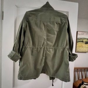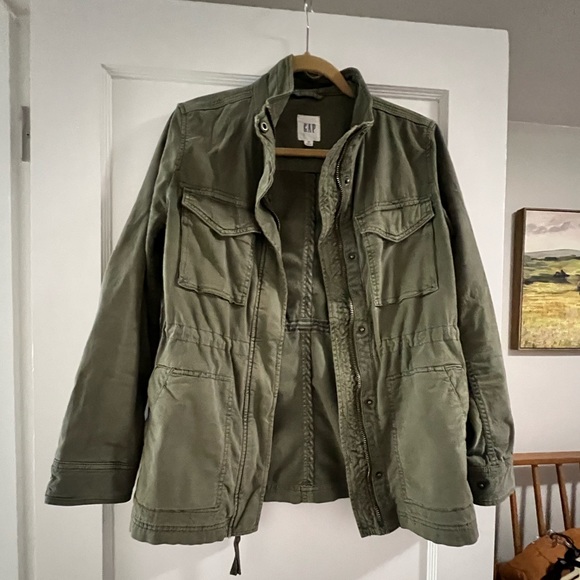 Army green jacket from The Gap. Adjustable cinch waist. Snaps on sleeves. Length hits at hips (5 ft 3")