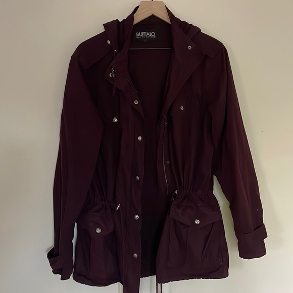 4 button closure pockets, hood and front zip up closure and snap buttons. Wine color