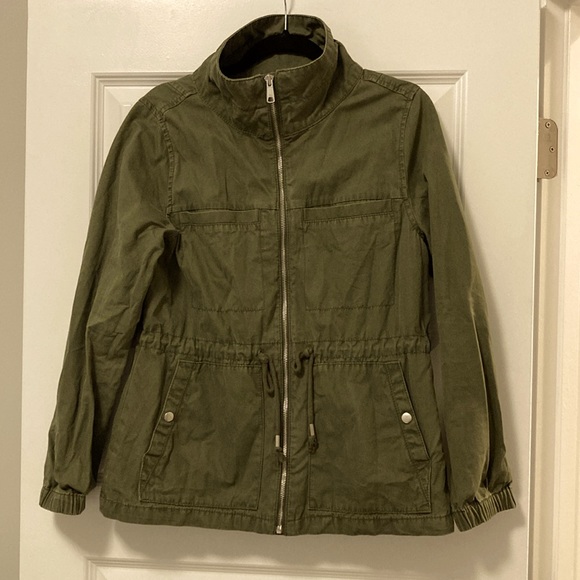 Olive green utility jacket. Size medium. Old navy. Functional zipper. Fits slightly larger than a true medium which is great for layering. No damage or stains. Pet free and smoke free home.