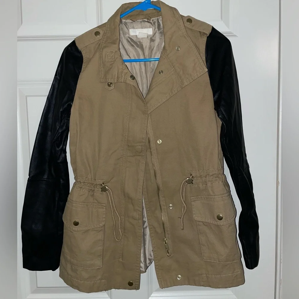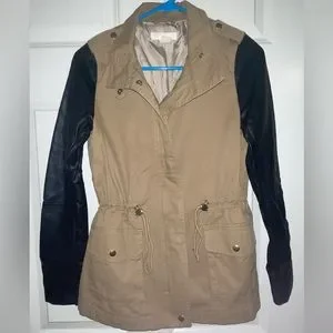 Faux-leather sleeved, tan utility jacket Cinch waist, zipper and button closure No major flaws 🔎